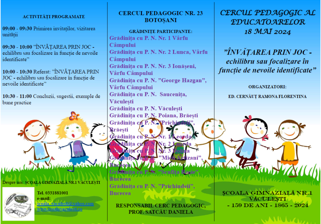 Sâmbătă, 18 mai 2024, Grădinița Nr. 1 Saucenița, structură a Școlii Gimnaziale Nr. 1 Văculești, a fost gazda reuniunii Cercului Pedagogic al educatoarelor Nr. 23 Botoșani, condus de responsabilul cercului, doamna prof. Satcău Daniela