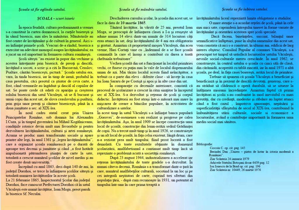 Gazdele au pregătit un pliant de prezentare generală a comunei Văculești și a istoricului învățământului, vizitarea unității școlare și prezentarea specificului activităților instructiv-educative, extracurriculare și proiectelor încheiate sau in derulare la nivelul celor trei cicluri de învățământ: preșcolar, primar și gimnazial.